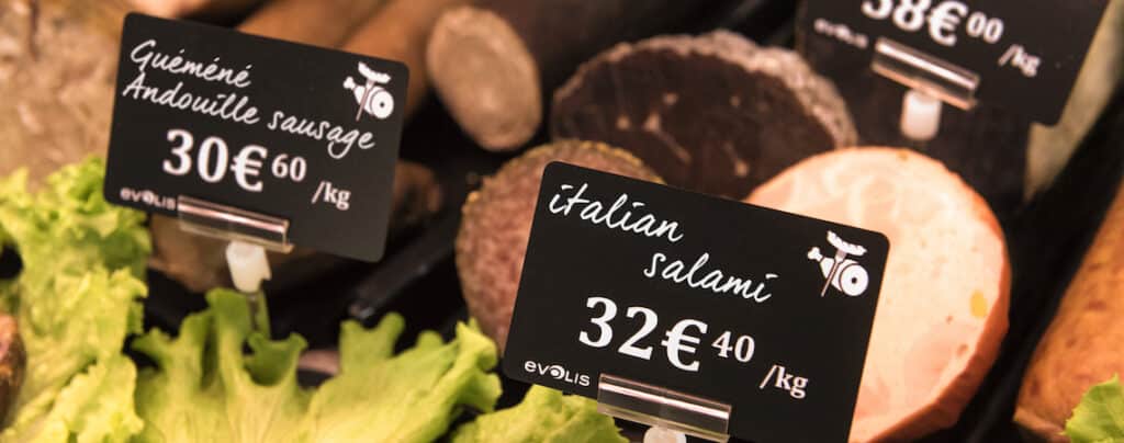 L’utilisation d’accessoires pour les cartes de prix est également un excellent moyen d’évoquer une qualité supérieure. Par exemple, un porte-étiquette est particulièrement recommandé pour les produits frais comme la viande, car non seulement il complète le produit et lui donne un caractère distingué, mais il permet également de manipuler les cartes de prix de manière plus hygiénique.