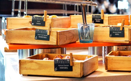 Chaque étiquette indique clairement la catégorie d’aliments, les allergènes (représentés par de petits pictogrammes) et aussi, les noms des plats en chinois / anglais afin de satisfaire une clientèle locale et internationale. La grande clarté des informations indiquées améliore ainsi l’expérience client dans l’hôtel.