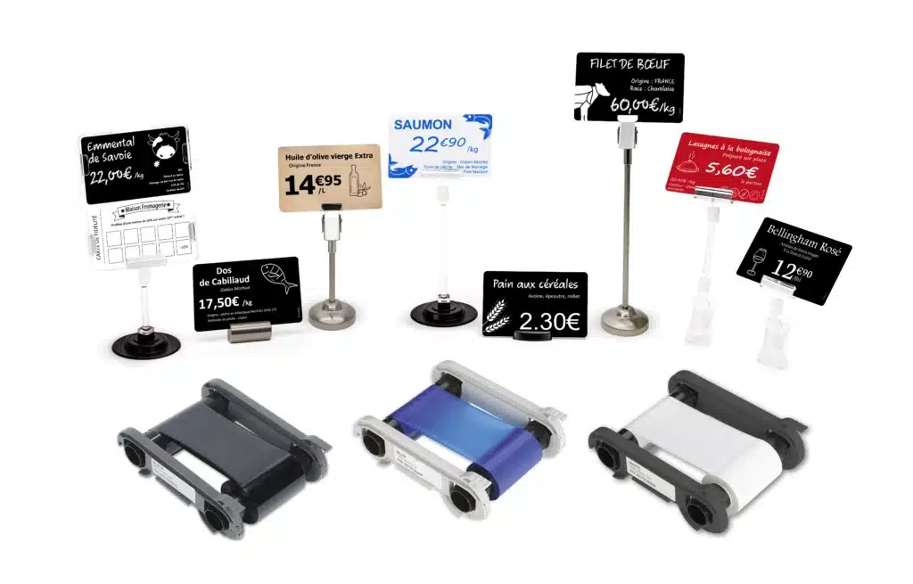 - Un ruban d’impression et 200 cartes PVC dédiées à l’utilisation dans le commerce alimentaire