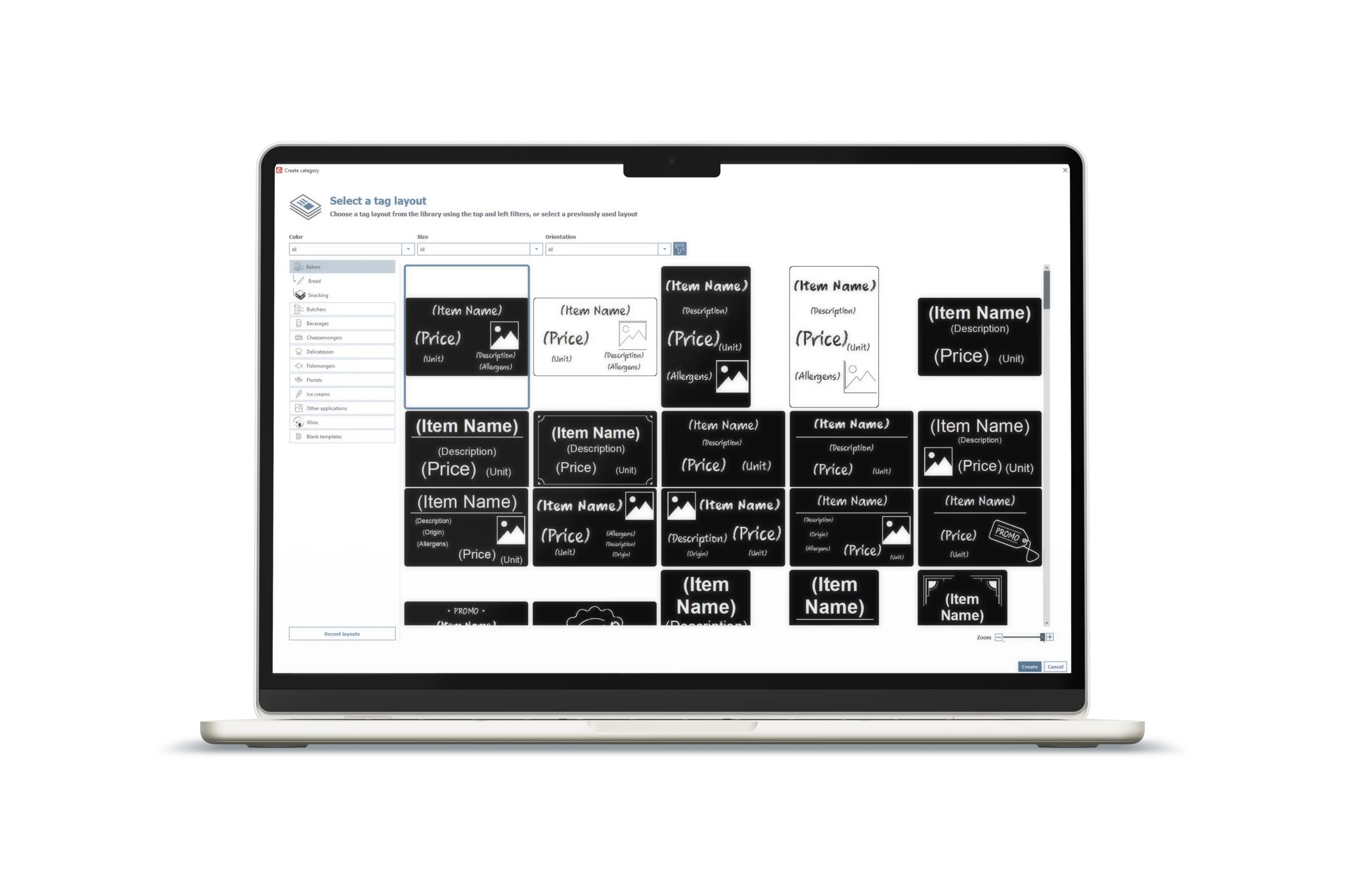 - Nombreux supports d’étiquettes adaptés aux étals standards
